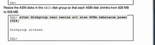 Resizo the ASM disks in the RECO disk group so that each ASM disk shrinks from 928 MB.10608 MB.