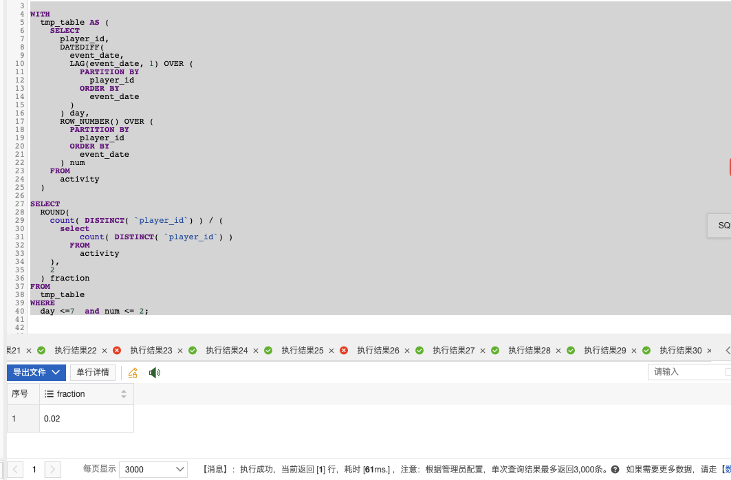 编写一个 SQL 查询,报告在首次游玩后的一周内至少再有一次游玩的玩家的比例,也就是注册首周内至少有两次登录的玩家占总玩家的比例,四舍五入到小数点后两位。