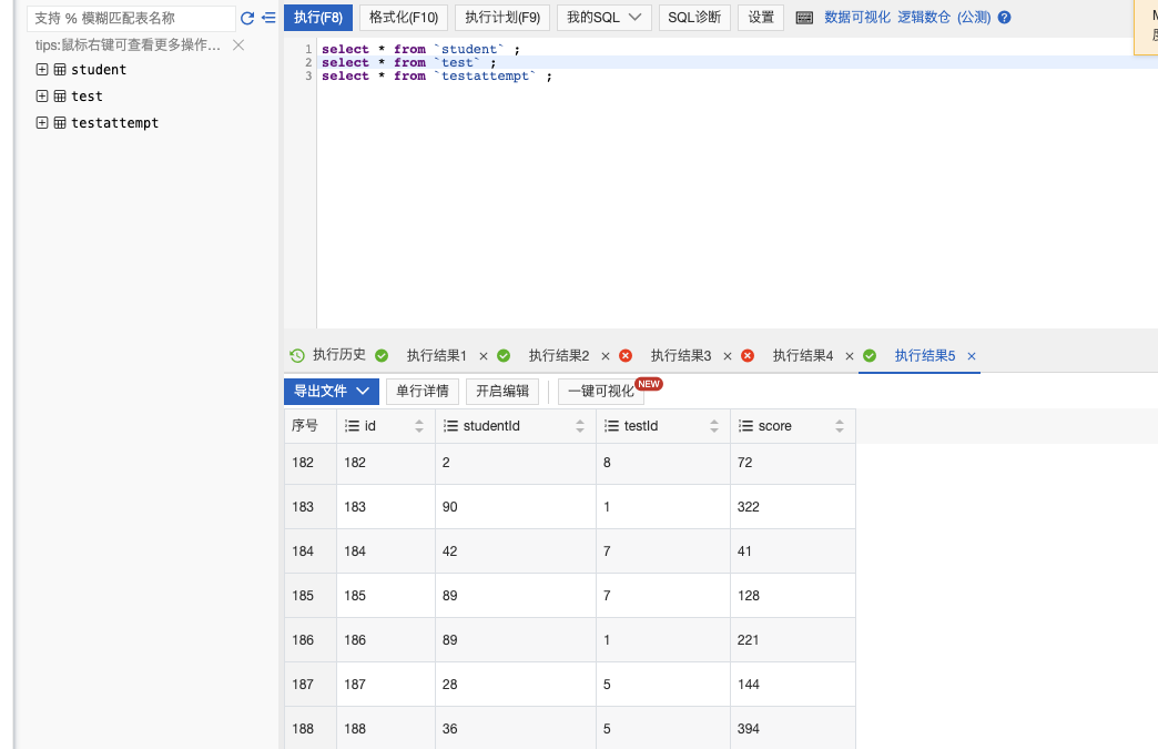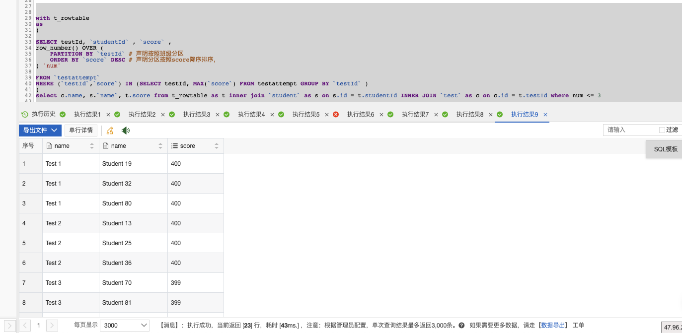 思路:首先SELECT * FROM `testattempt` WHERE (`testId`,`score`) IN (SELECT testId, MAX(`score`) FROM testattempt GROUP BY `testId` ) order by `testId` , `score` desc执行上面的sql找出每门课程最高的成绩,然后子查询一下,获取所有的考试分数最高的学生,但是这里还会有很多并列的分数接着使用一个分区排名函数进行排序,有了序号,就容易了,只要前三筛选一下就好了。