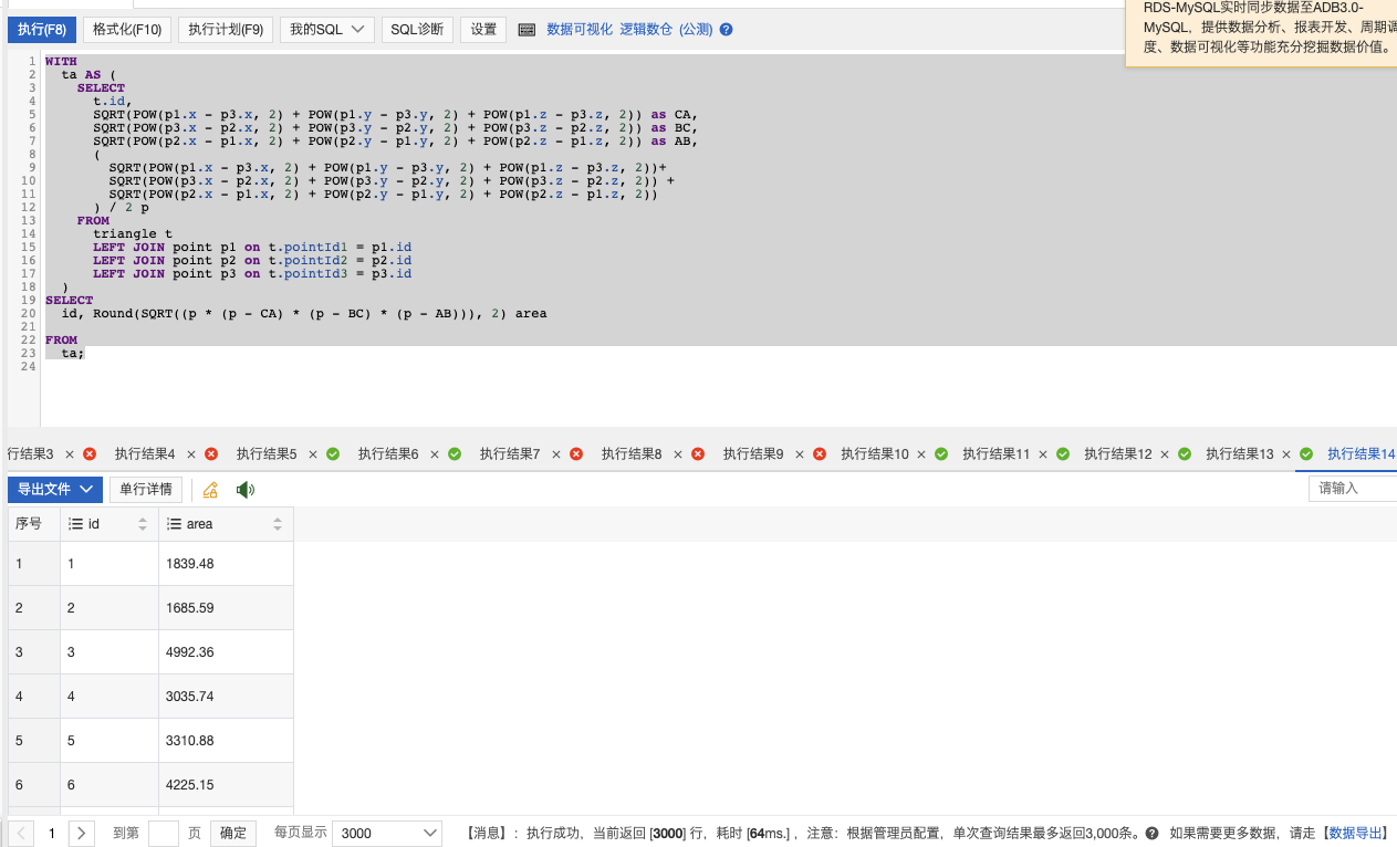 id, Round(SQRT((p * (p - CA) * (p - BC) * (p - AB))), 2) area