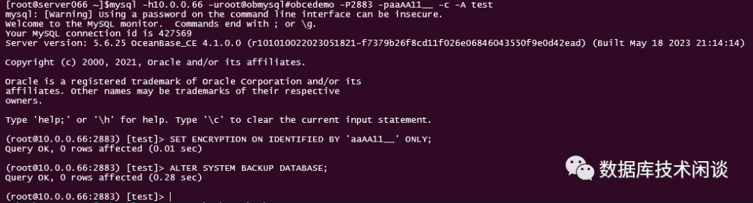 [root@server066 ~]$mysql -h10.0.0.66 -uroot@obmysql#obcedemo -P2883 -paaAA11__ -c -A testALTER SYSTEM SET LOG_ARCHIVE_DEST='LOCATION=file:///backup/obcebackup/obmysql' ;