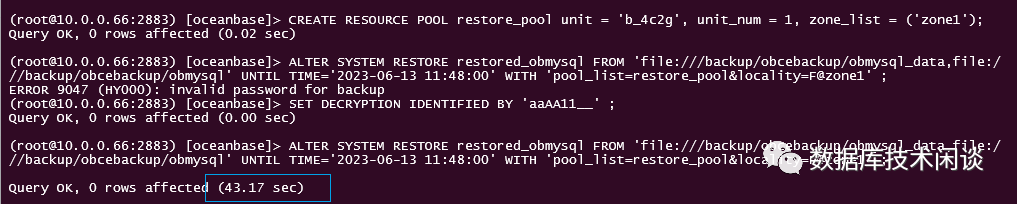 ALTER SYSTEM RESTORE restored_obmysql FROM 'file:///backup/obcebackup/obmysql_data,file:///backup/obcebackup/obmysql' UNTIL TIME='2023-06-13 11:48:00' WITH 'pool_list=restore_pool&locality=F@zone1' ;