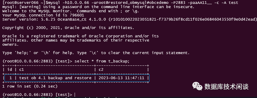 [root@server066 ~]$mysql -h10.0.0.66 -uroot@obmysql#obcedemo -P2883 -paaAA11__ -c -A test<...>Type 'help;' or '\h' for help. Type '\c' to clear the current input statement.(root@10.0.0.66:2883) [test]> create table t_backup(id bigint not null auto_increment primary key, c1 varchar(100) , c2 timestamp default current_timestamp );Query OK, 0 rows affected (0.88 sec)(root@10.0.0.66:2883) [test]> insert into t_backup(c1) values('test ob 4.1 backup and restore');Query OK, 1 row affected (0.41 sec)(root@10.0.0.66:2883) [test]> insert into t_backup(c1) values('test ob 4.1 backup and restore 2 ');Query OK, 1 row affected (0.03 sec)(root@10.0.0.66:2883) [test]> select * from t_backup;+----+-----------------------------------+---------------------+| id | c1 | c2 |+----+-----------------------------------+---------------------+| 1 | test ob 4.1 backup and restore | 2023-06-13 11:47:11 || 2 | test ob 4.1 backup and restore 2 | 2023-06-13 11:48:08 |+----+-----------------------------------+---------------------+2 rows in set (0.01 sec)