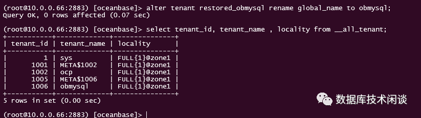 alter tenant restored_obmysql rename global_name to obmysql;select tenant_id, tenant_name , locality from __all_tenant;