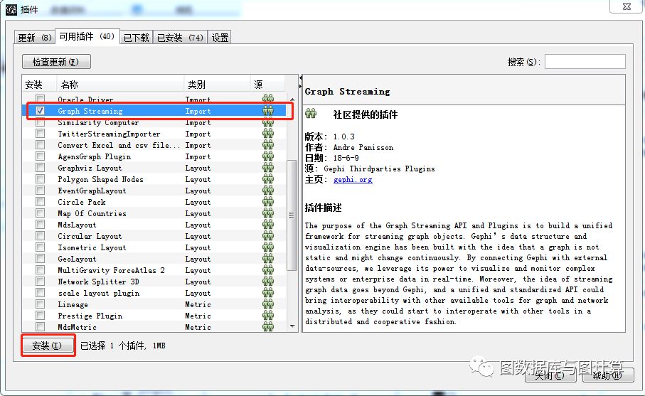 进入"工具"->"插件"菜单,在"可用插件"中选中"Graph Streaming",并点击左下方的"安装"按钮。