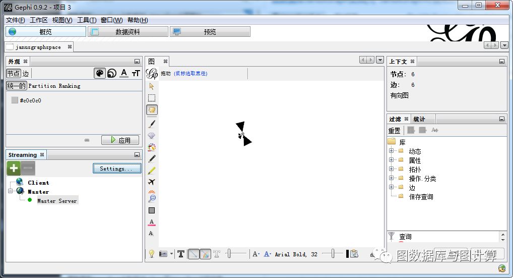 从右上角的"上下文"窗口中可以看到导入了6个节点和6条边,但这个图很丑,需要格式化(美化)。