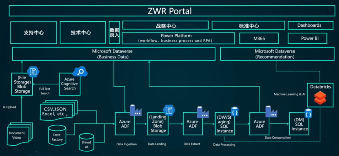 面对迫切的业务需求,百威中国选择与微软企业服务部携手打造大区-工厂网格化智造体系。基于微软Azure Cognitive Search、Azure Data Factory (ADF)为底层技术,以 Microsoft Dataverse 作为可靠的数据载体,在微软 Azure 的完善体系支持下,全面搭载 Power Platform、 Power BI、Microsoft 365 及 Teams 等微软技术产品,将生产制造、业务运营、大区协作三大模块整合为百威大区作战室(Zone War Room,以下简称 ZWR)系统,打造了真正意义上智造一体化智慧大脑,让百威中国每一位成员得以跨越时间、空间与专业领域,为共同的战略目标并肩作战,携手酿造更美好未来!