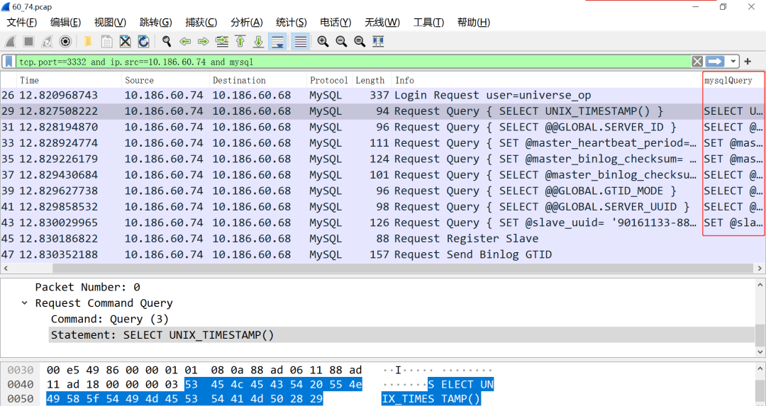 以下显示过滤器表达式中的内容表示:将包中 TCP 端口为 3332,源端 IP 地址为 10.186.60.74,协议类型为 MySQL 的内容过滤并展示,效果如图:
