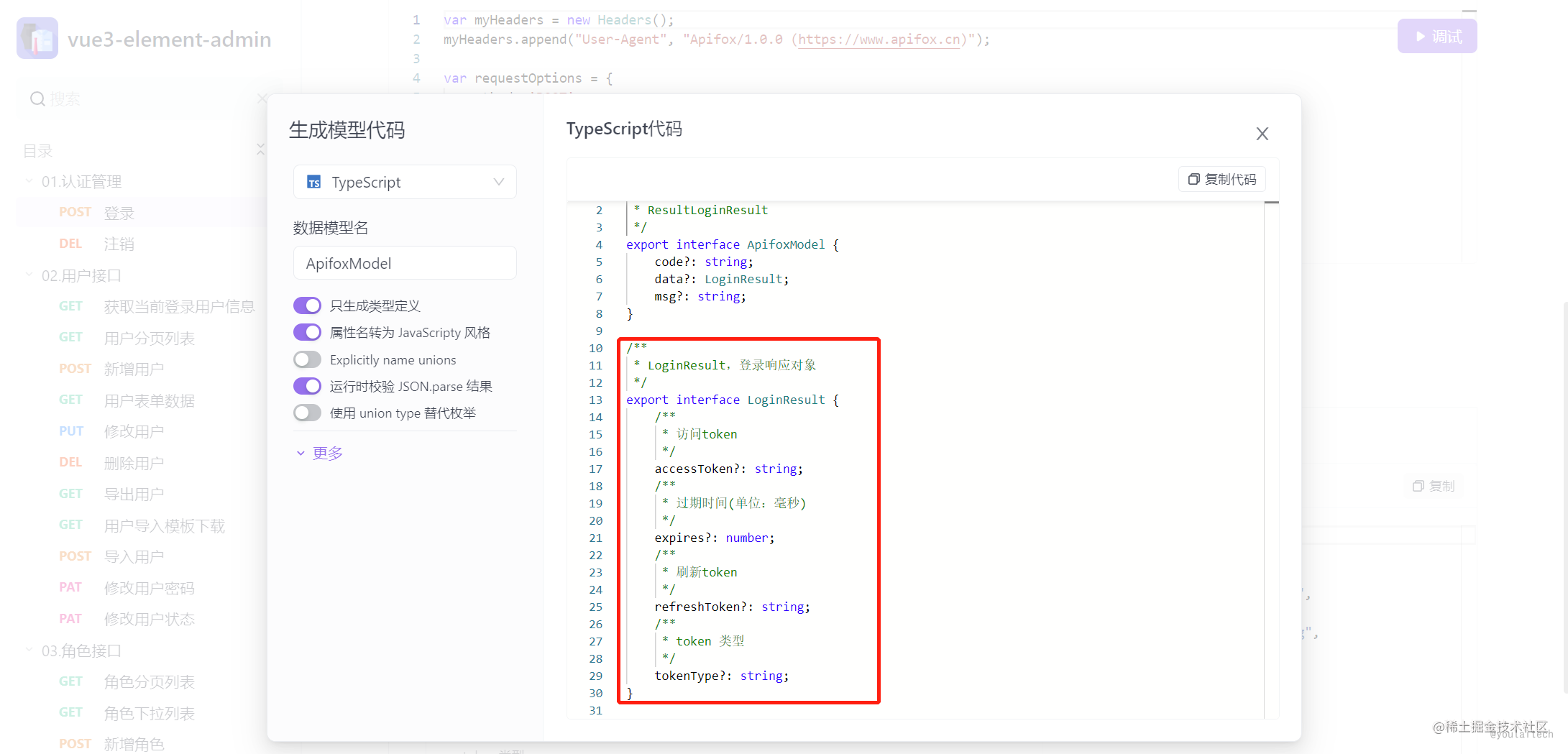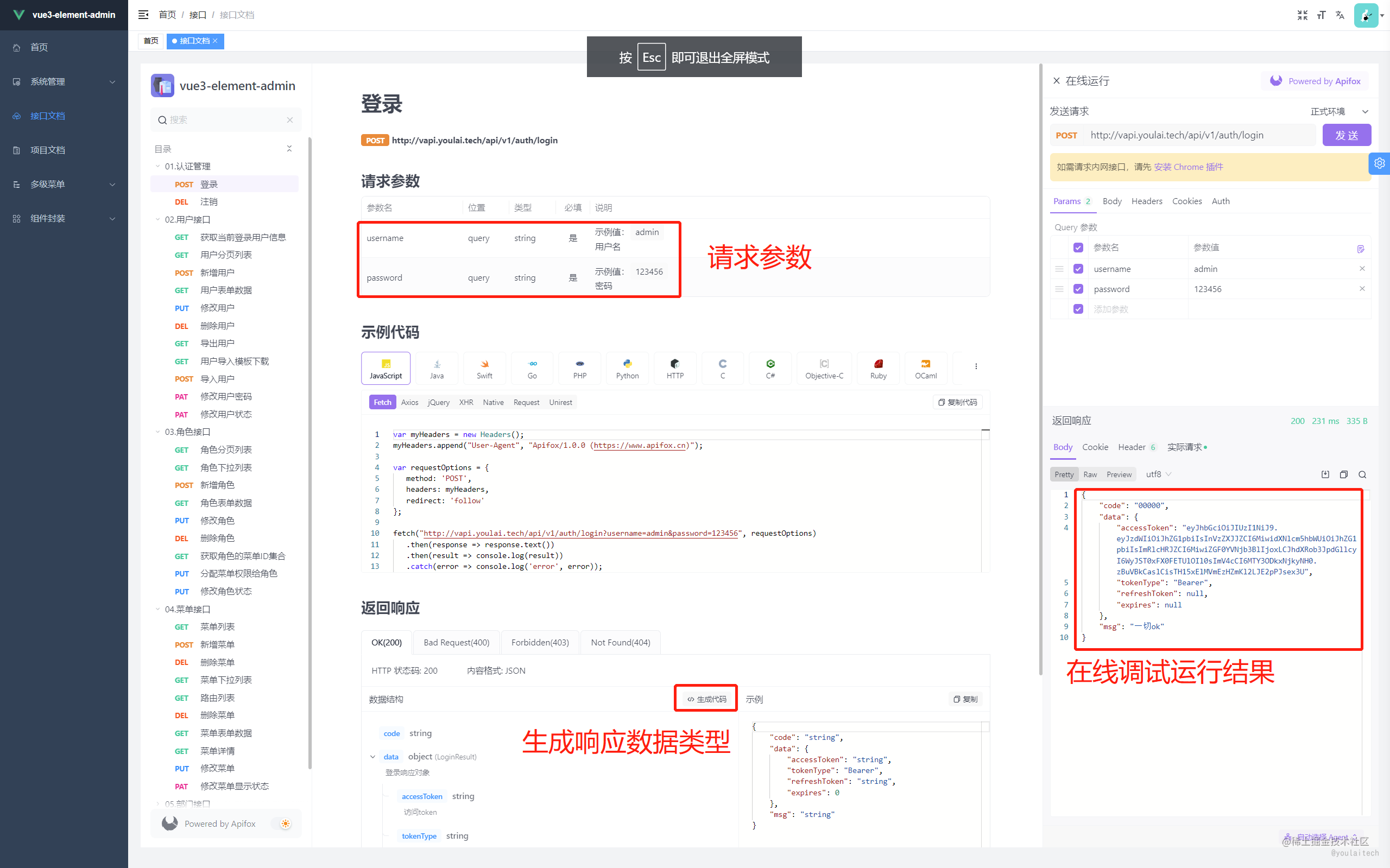 配套完整 Java 后端 权限管理接口,开箱即用,提供 OpenAPI 文档 搭配 Apifox 生成 Node、Python、Go等其他服务端代码;