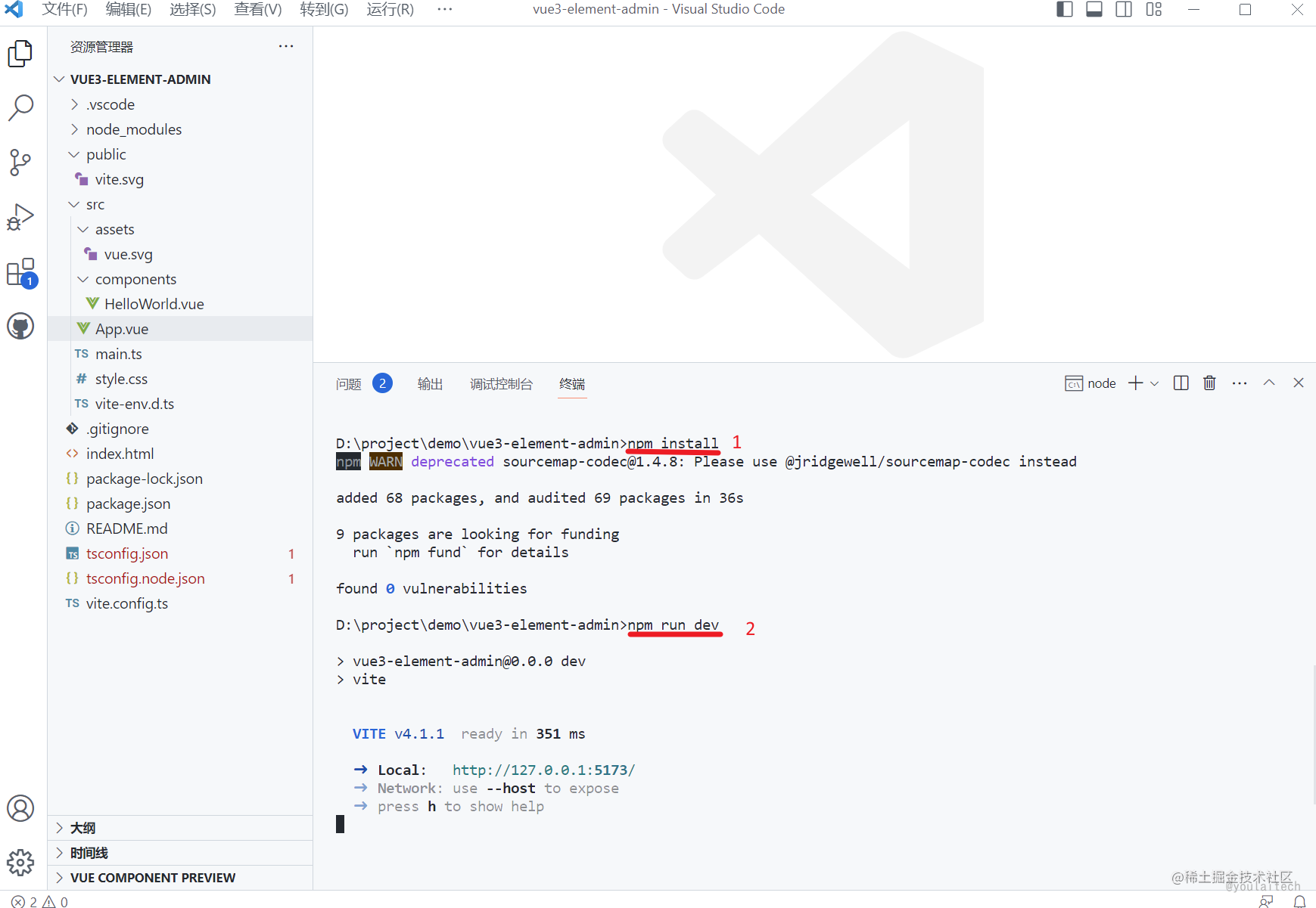 初始化完成项目位于 D:\project\demo\vue3-element-admin , 使用 VSCode 导入,执行以下命令启动: