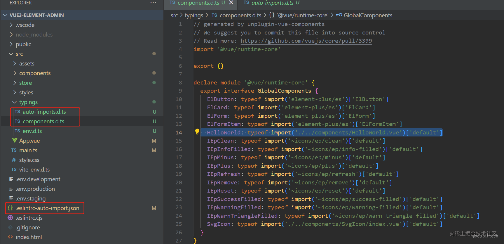 | unplugin-vue-components | 按需自动导入组件 | Element Plus 等三方库和指定目录下的自定义组件 |
