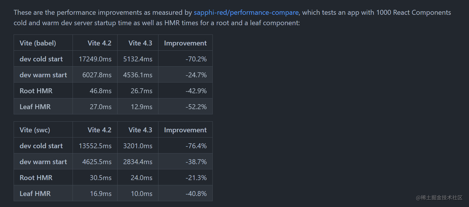 Dev Server要把请求需要的资源发送给浏览器,中间需要经历预构建、对请求文件做路径解析、加载源文件、对源文件做转换,然后才能把内容返回给浏览器,这个时间耗时蛮久的,导致白屏时间较长。解决方案升级 vite 4.3 版本 github.com/vitejs/vite…