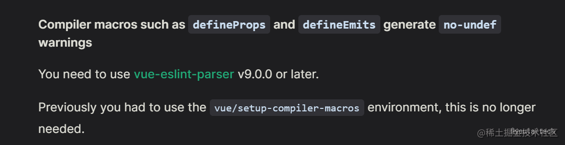 vue-eslint-parser解析器npm install -D vue-eslint-parser.eslintrc.js关键配置(v9.0.0及以上版本无需配置编译宏vue/setup-compiler-macros)如下 :parser: 'vue-eslint-parser', extends: [ 'eslint:recommended', // ... ],重启