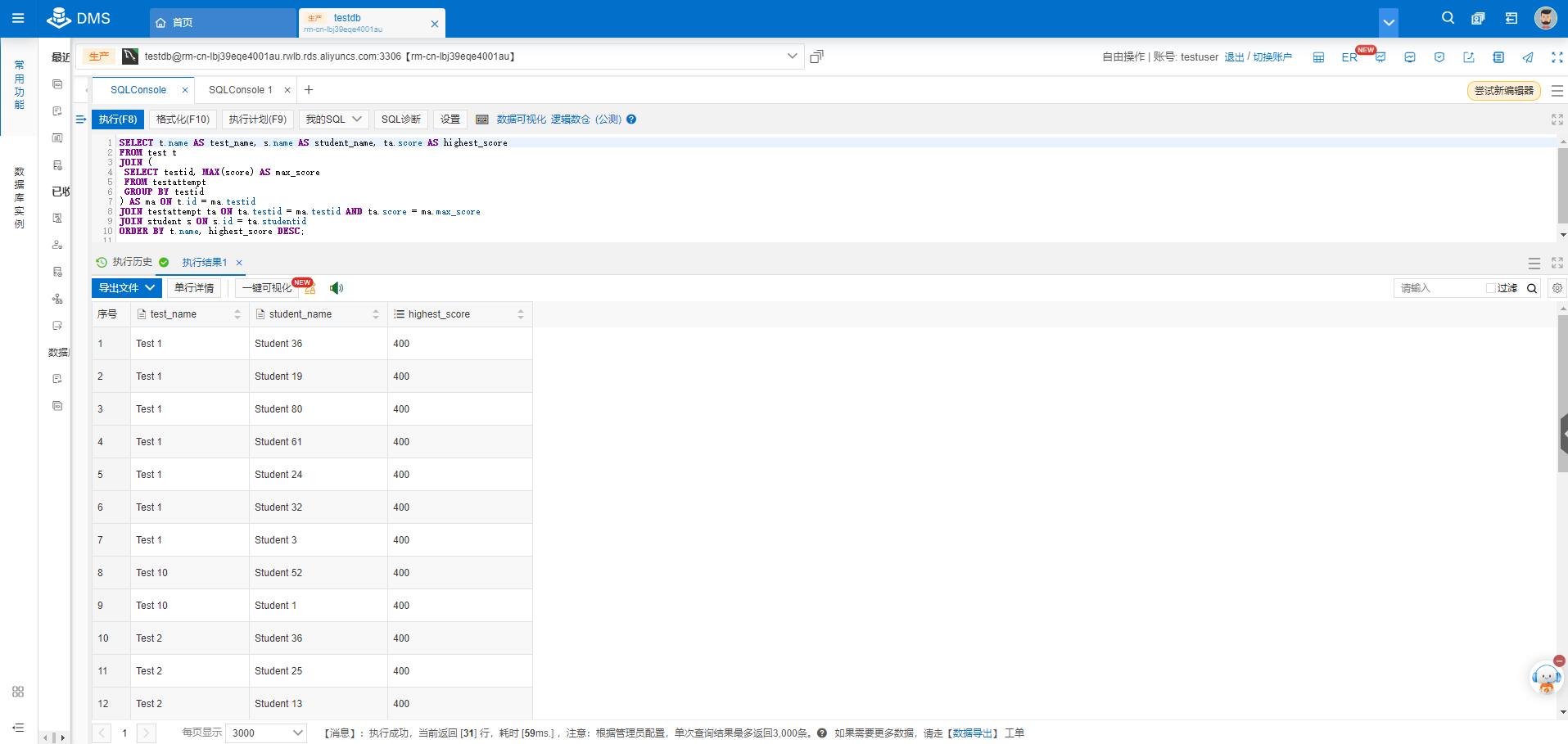 SELECT t.name AS test_name, s.name AS student_name, ta.score AS highest_score FROM test t JOIN ( SELECT testid, MAX(score) AS max_score FROM testattempt GROUP BY testid ) AS ma ON t.id = ma.testid JOIN testattempt ta ON ta.testid = ma.testid AND ta.score = ma.max_score JOIN student s ON s.id = ta.studentid ORDER BY t.name, highest_score DESC;