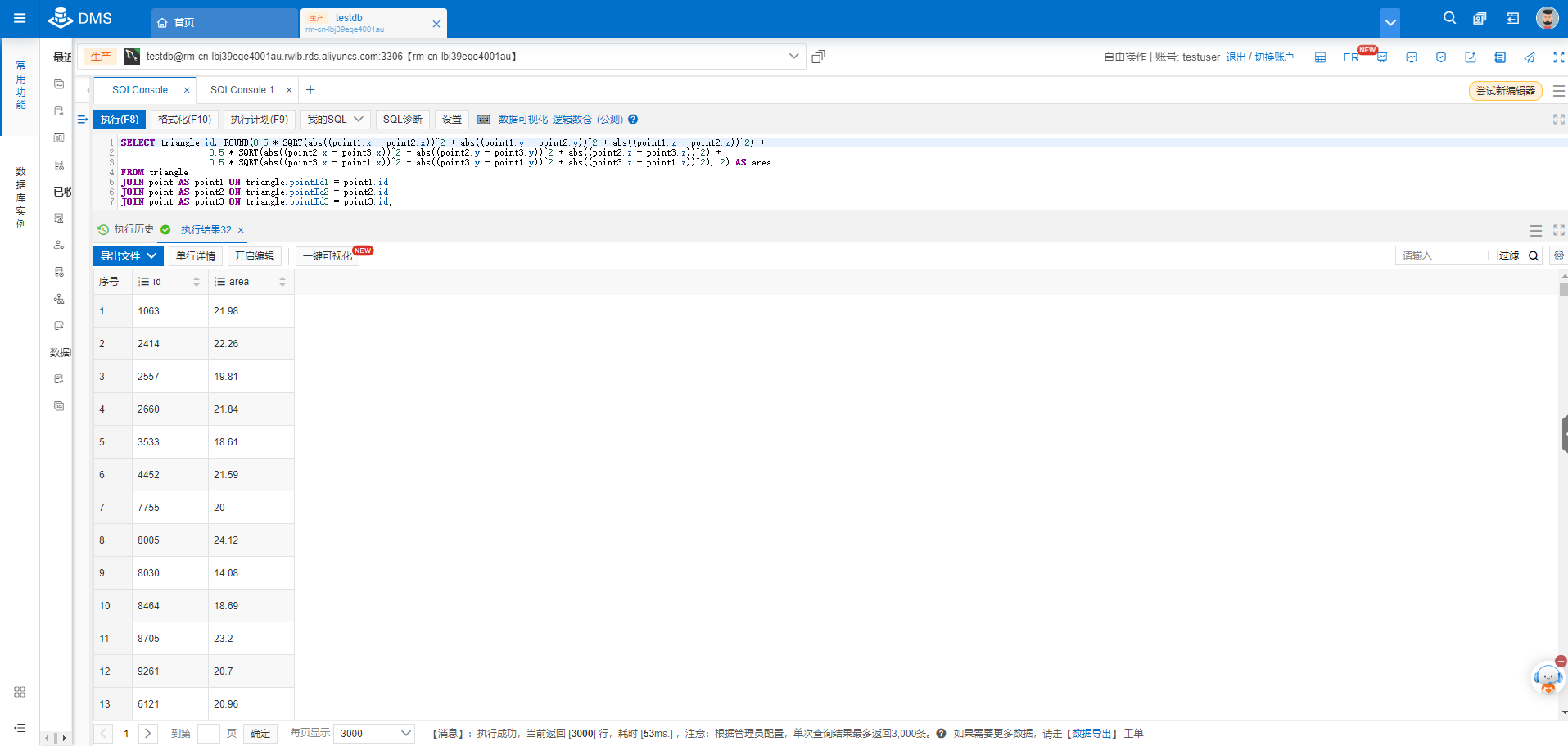该SQL语句通过JOIN操作连接Triangle表和Point表,以获取每个三角形的三个顶点信息。在计算面积时,该语句使用了每个顶点对之间的距离平方,并将它们相加。