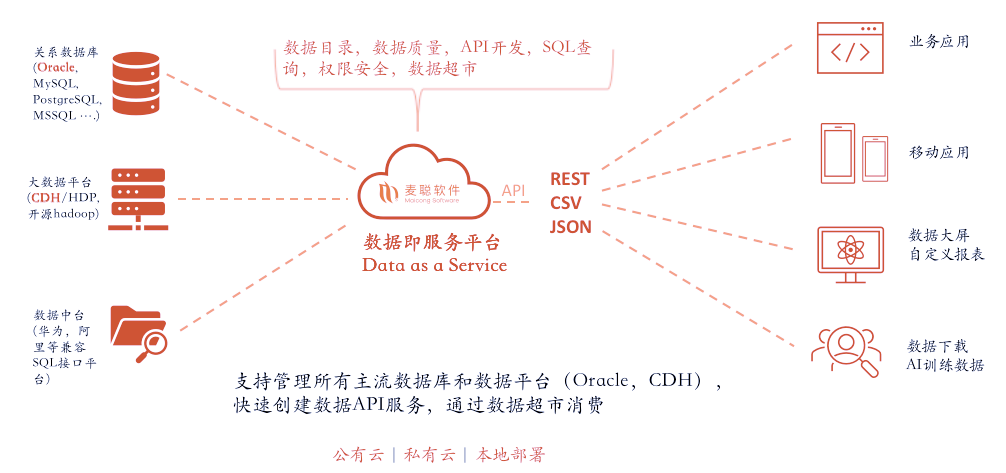然而,对于大部分企业客户来讲,数据安全是首要问题,如何在自己本地数据平台上实现数据高效运转,发挥数据价值,是每一个企业考虑的关键问题。麦聪软件可以在用户提供的服务器和数据库平台上,通过数据API服务,在用户可控网络环境下共享和处理数据。