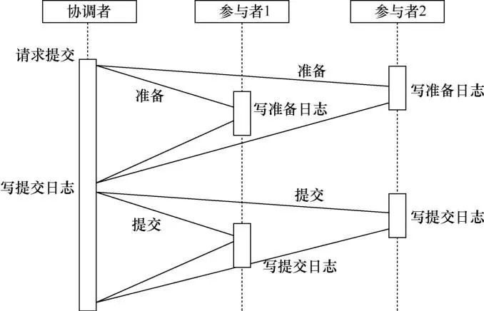 在CBASE的分布式事务引擎实现中,采用如图3所示的优化的两阶段提交,保证事务的强一致性。当无故障时,该协议实现比较简单;但当发生故障时,如服务器下线、消息丢失或网络故障,采用超时动作防止进程无限阻塞,因此协议实现时,在进程可能阻塞的每一步都加入超时动作。在最坏的情况下,两阶段提交协议在执行过程中可能出现任意多次服务器故障和通信故障,并造成参与者很长时间停留在不确定状态上,这就是未决事务。
