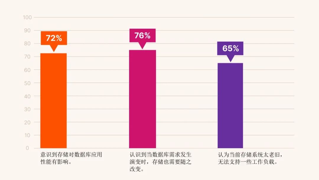 Pure Storage发布的《数据库技术栈的现代化进程》研究报告显示,72%的受访企业已经意识到,存储对数据库应用性能有影响;更高比例(76%)的受访企业认为,当数据库需求发生演变时,存储也需要随之改变。