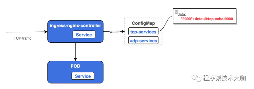 Kubernetes Ingress Controller 在启动时会去watch两个configmap(一个tcp,一个 udp),里面记录了后面需要反向代理的TCP的服务以及暴露的端口。如果里面的key-value发生变换,Ingress controller 会去更改 Nginx 的配置,增加对应的 TCP 的 listen 的 server 以及对应的后端的 upstream。