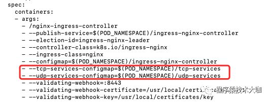 ,在 ingress-nginx-controller 中新增参数 tcp-services-configmap、udp-services-configmap,如下图所示: