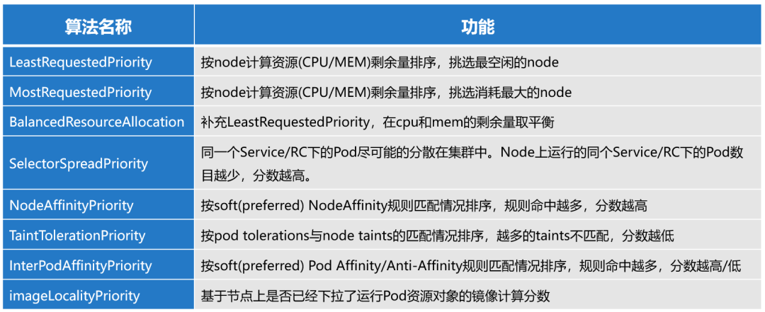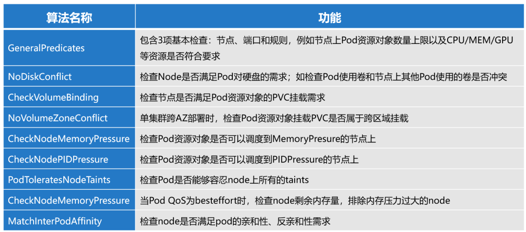 主要有两类算法:Predicate和Priority。Predicate是对于所有的node进行筛选,滤除不合格的节点,Priority是对于Predicate筛选过的node进行打分,挑选最优的节点。通过Predicate策略筛选符合条件的Node,主要是node上不同的pod会存在资源冲突,Predicate主要的目的是为了避免资源冲突、节点超载、端口的冲突等。