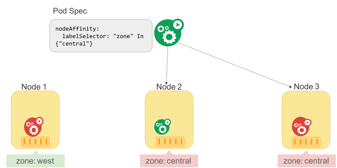 Node Affinity特性是让Pod在一组指定的Node上运行,下图案例是通过简单的selector机制希望pod能运行在label-key为zone,Value是central的node上,node2与node3都匹配这样的规则,因此pod可以调度在node2与node3上。