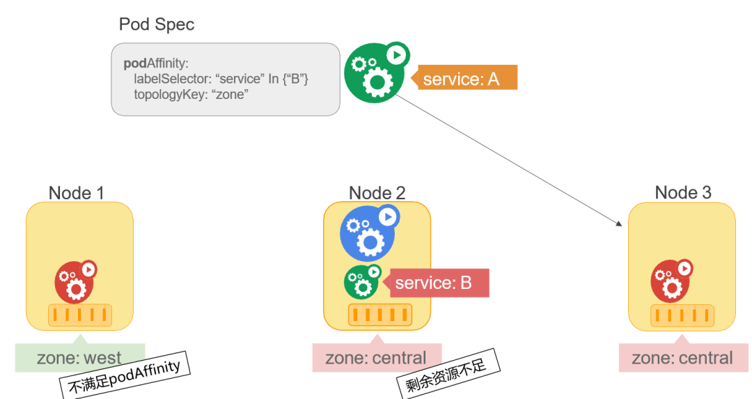 Pod Affinity是让Pod与指定Service的一组Pod在相同Node上运行,下图案例是希望serviceA 的pod和serviceB的pod能够调度在同一个区域,区域指定的是topologyKey“zone”,希望serviceA和serviceB的pod能够调度在同一个zone,在node1、node2、node3里,按照zone的value划分,node1属于一个组,node2与node3属于一个区域,因为node2的资源余量不足,serviceA 的pod最终调度在node3上,如此也符合serviceA 和serviceB在zone级别亲和的规则。