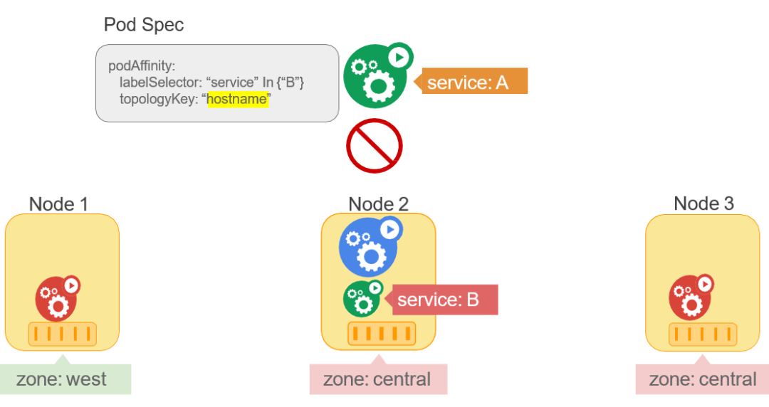若将topologyKey从zone改成hostname,我们希望serviceA 的pod和serviceB的pod能够运行在同一个host上,因为node2没有剩余资源,serviceA没有办法按照这个规则筛选出合适的节点,则serviceA处于不可调度的状态。