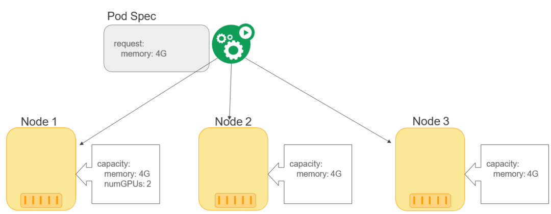 案例: 有3个节点,node1有GPU资源,首先在集群提交一个普通的node,此时它是可以调度到node 1、node2、node3任意一个节点。