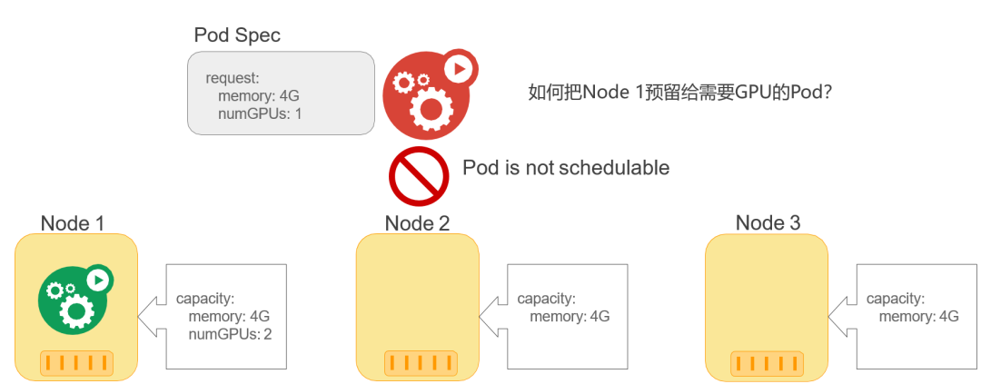 假设调度到node1,然后提交一个GPU需求的pod,因为node2与node2没有GPU资源,node1有GPU资源,但node1的memory已经耗尽,此时GPU的pod处于不可调度的状态。这个案例其实是不合理的,我们希望能够把有GPU的node1资源留给GPU的pod使用,但并没有达到预期效果。