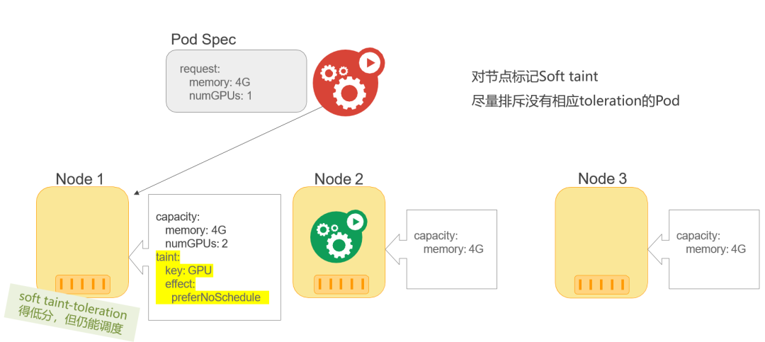 在这个场景下,非常适合使用Taints-tolerations机制,在node1进行taint标记,node2与node3不满足资源的基本需求已经被过滤,node1可以满足pod的资源需求量,配置了软性的Taint-toleration,Priority算法对node1打了一个比较低的分,但其是一个软性的亲和,虽然分数比较低但是是唯一满足pod资源需求的,最终GPU的pod被调度到node1的节点上,达到预期效果。
