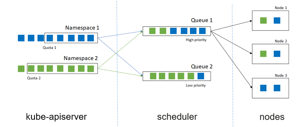 Namespace与Queue的设计是解耦的关系,同一个namespace可以将任务提交到不同Queue,不同的namespace的任务也可以提交到同一个Queue,用户可以灵活使用。我们提供了3个级别的公平调度机制,Queue不同job之间的公平调度、Queue里不同namespace之间的公平调度与Queue与Queue之间的公平调度。