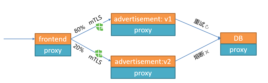 连接能力:连通服务之间的调用,Frontend服务可以访问Advertisement服务,Advertisement服务来访问database服务