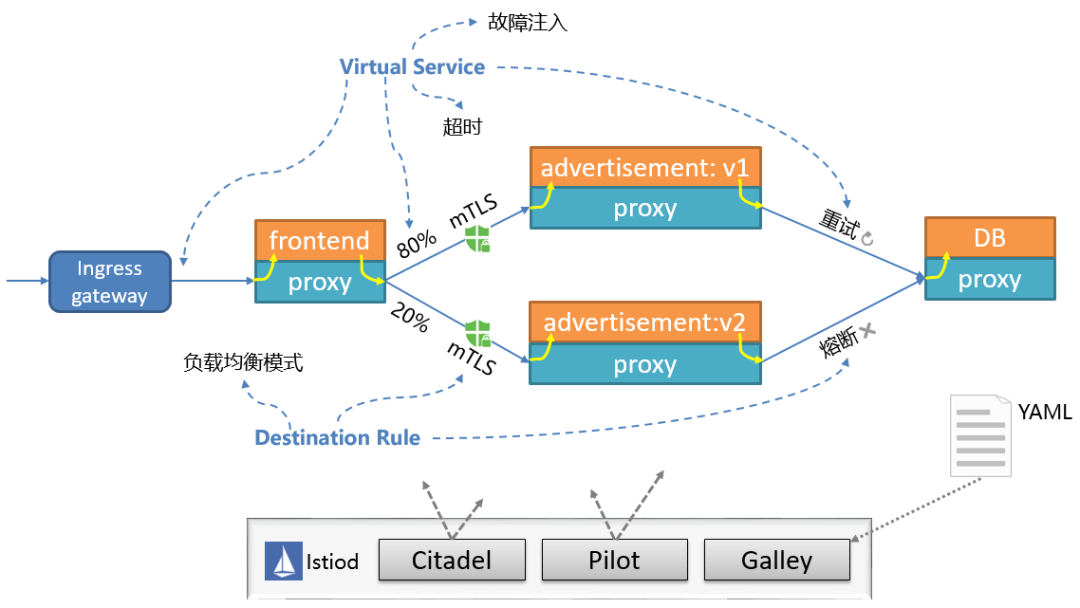 流量管理:负载均衡、连接池管理、熔断、故障注入等;