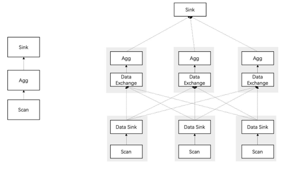 逻辑执行计划的Agg阶段变成了物理执行计划中的先重分布然后汇总的两个步骤,这个过程和Hadoop是类似的,都是按照相同的Key进行数据重分布。