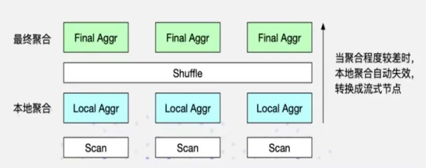 在此基础上,Doris还实现了自适应的聚合算法。首先我们要知道,聚合算子是一种阻塞型算子,需要等到全部数据处理完成后,才会将数据发送给上层节点。而自适应聚合算法的意思是,在第一级聚合算子中,如果发现数据的聚合效果很低,即使聚合后也无法有效降低需要传输的数据量,则会自动停止第一级聚合,而将算子转换为一个非阻塞的流式算子,直接将读取到的数据发送到上层节点,从而避免不必要的阻塞等待时间。