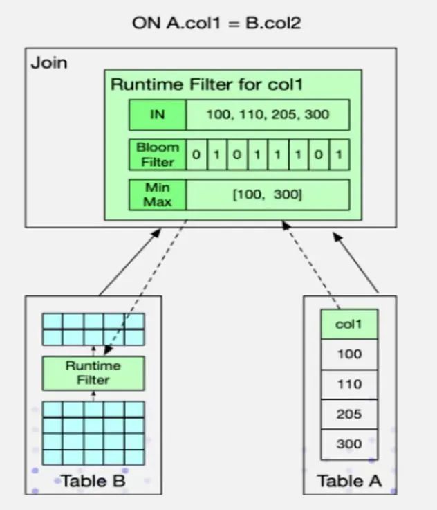 针对Join算子,Doris也进行了大量优化,其中Runtime Filter是很重要的一种优化方式。在两个表的Join操作中,我们通常将右表称为BuildTable,而将左表称为ProbeTable。在实现上,通常首先读取右表的数据,在内存中构建一个HashTable,然后开始读取左表的每一行数据,并在HashTable中进行连接匹配,返回符合连接条件的数据。通常来说,左表的数据量会大于右表的数据量。