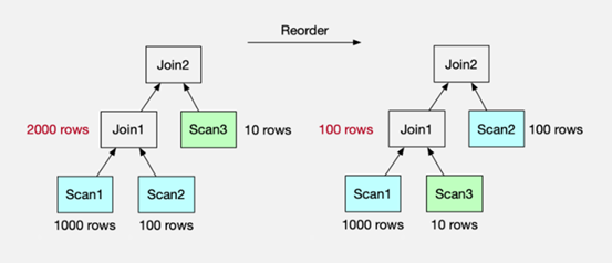 Join Reorder功能可以通过一些表的统计信息,自动的调整Join的顺序。而Join顺序的调整,会显著降低Join操作中生成的中间数据集的大小,从而加速查询的执行,如图7所示。