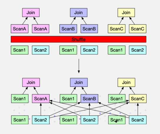 Join会更智能地自动判断SQL中的关联条件和数据分布之间的关系,将原本需要同时Shuffle的左右两张表的数据的操作,变成仅将右表数据重分布到左表所在的节点,从而减少数据的移动量。如图9所示。