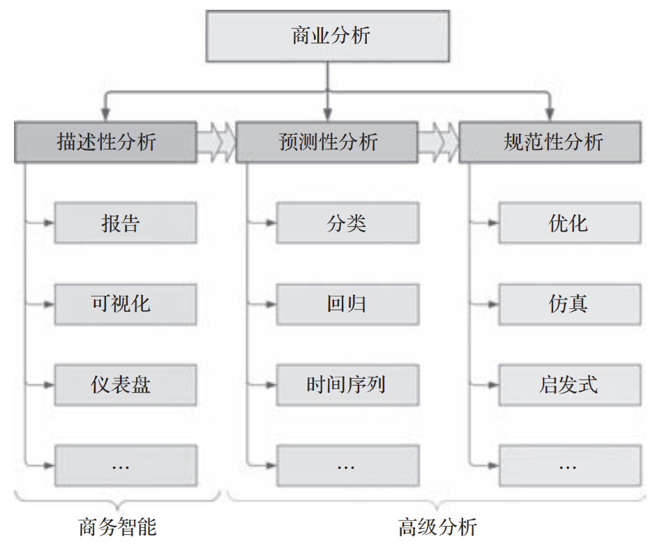 描述性分析又称为商务智能,预测性分析和规范性分析统称为高级分析。这里的逻辑是,由于从描述性分析到预测性分析或规范性分析存在复杂度的显著转变,因此需要使用“高级”这个标签。自 21 世纪初以来,商务智能已经成为设计支持管理决策的信息系统最流行的技术趋势。直到分析浪潮到来之前,商务智能一直很受欢迎(在某种程度上,它仍然在一些商业圈中很流行)。商务智能是通向分析世界的门户,为更复杂的决策分析奠定基础并铺平道路。描述性分析系统通常以数据仓库为基础,数据仓库是专门为支持商务智能功能和工具而设计、开发的大型数据库。