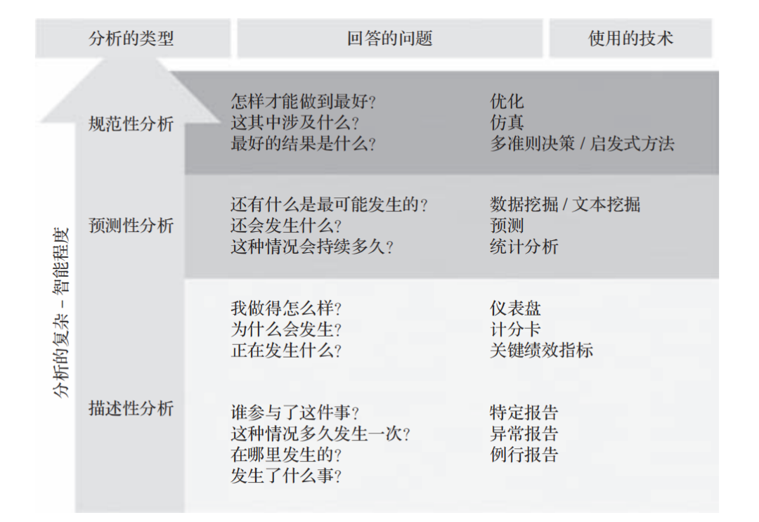 凯捷的研究给出了分析的简洁定义:“分析通过报告数据来分析趋势,通过构建模型来进行预测和业务流程优化,最终提高绩效并促进商业目标的实现。”正如该定义所指出的,这项研究的关键发现之一是,高管将分析视为使用它的企业的核心功能。分析贯穿组织中的多个部门和职能。在成熟的组织中,分析则贯穿整个企业。这项研究将分析分为描述性分析、预测性分析和规范性分析。这三组分析有时会重叠。根据组织的分析成熟度级别,这三组是分层级的。大部分组织从描述性分析开始,然后转向预测性分析,最后实现规范性分析,即分析层次结构的最高层。虽然这三组分析在复杂性上是分层的,但是较低层次和较高层次之间的界限并不明确。也就是说,企业在处于描述性分析的时候,也可以以某种零碎的方式使用预测性分析甚至规范性分析。因此,从一个层次移动到下一个层次在本质上意味着上一层次的分析已经成熟,下一层次的分析正在被广泛使用。图1所示的是INFORMS 开发的简单分析分类的图形化描述。它已经被大多数行业领袖和学术机构广泛采用。