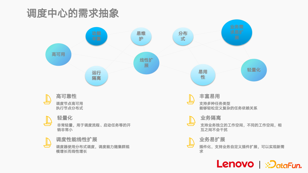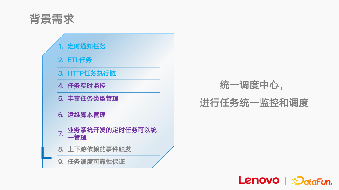 对于统一的调度中心,联想内部当时收集了各个业务 Domain 的需求,主要分为三大类:(1)支持任务的丰富性,除了日常需要的定时通知任务等功能,如日报周报、邮件通知等,也需要支持大数据领域的 ETL 任务和非大数据场景下的 HTTP 任务,具体包括数据集成、数据处理、调用 HTTP API 接口等。同时接口之间的请求参数也有依赖关系,这些都需要调度中心能够支持。(2)任务管理和编排,当任务越来越多,任务依赖关系变得越来越复杂时,就需要进行统一管理和编排,并对他们的执行情况做监控,看任务是否按照逻辑顺序正确执行。此外一些在第三方业务系统里通过 Spring 开发的定时任务,也需要纳入统一管理。 (3)关注 SLA,当任务量越来越大的时候要保证调度按时可靠地执行,并且任务的上下游依赖要能够更快更实时的按序触发。