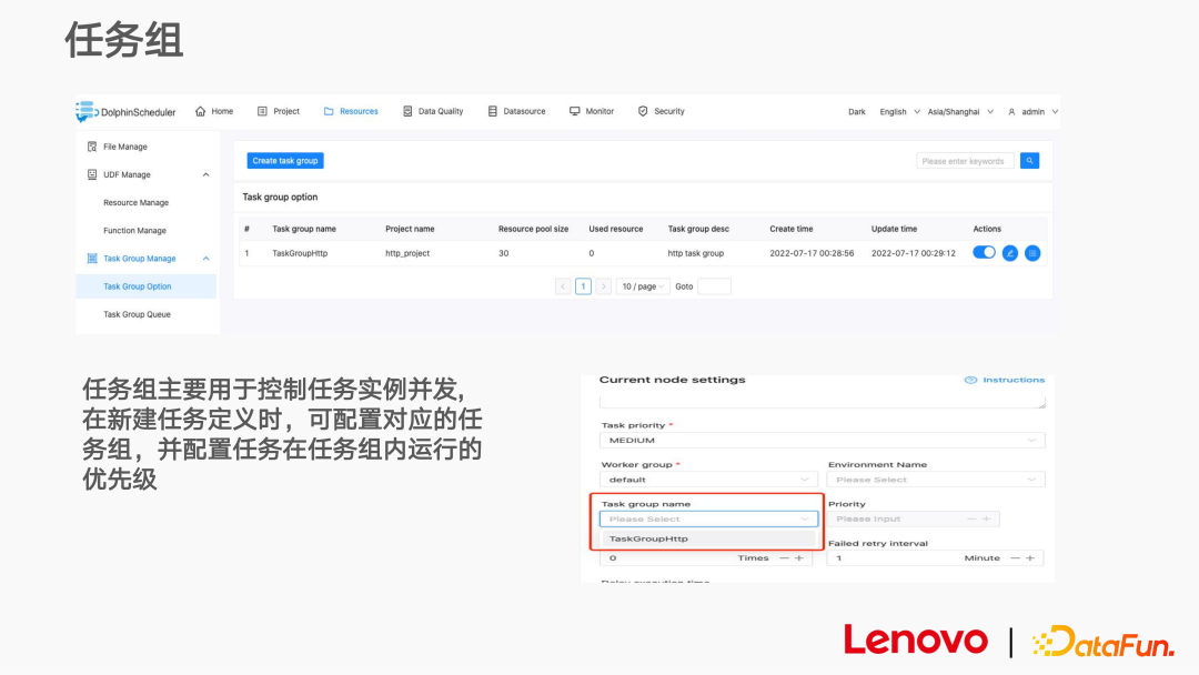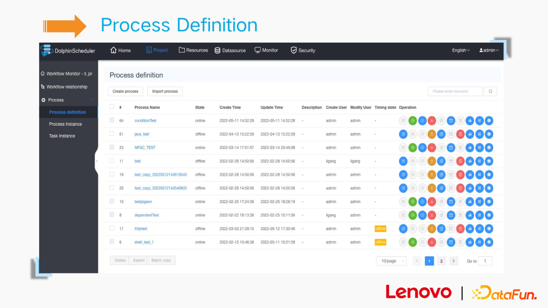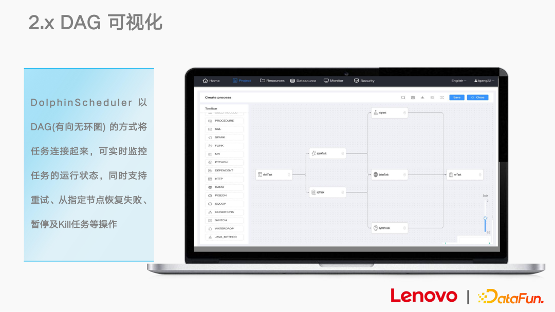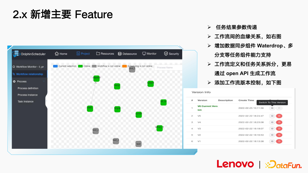 DolphinScheduler,目前已接入了多个业务 Domain 到生产环境。在联想内部,各个业务里面有不同的需求,比如,不同的任务类型,以及任务间需要依赖、参数传递等。所以,在接入 DolphinScheduler 后进行一些功能的改造。