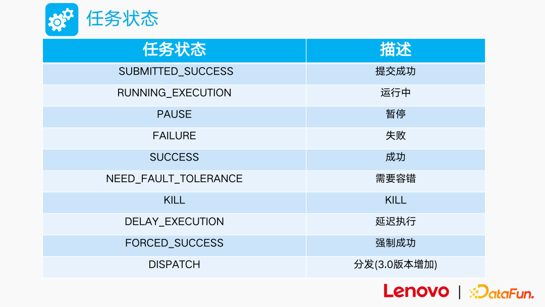 任务有多种状态。当 Master 生成任务实例的时候,任务默认为提交成功的状态。当 Master 分发任务给 Worker,Worker 拿到后开始执行,会向 Master 汇报状态。这个时候 Master 会把提交成功的任务状态更改为运行中。当正在运行的工作流实例被暂停,任务就会显示为暂停状态。任务执行完成会显示最终状态,比如失败、成功或 KILL。当某个 Worker 节点挂掉时,任务需要容错,这时需要容错的状态,由其他的 Worker 进行接管。当工作流实例被执行 KILL 操作,任务也会变成 KILL 状态。在 DolphinScheduler 3.0 的时候增加了在提交成功与运行中之间的一个状态,分发状态。