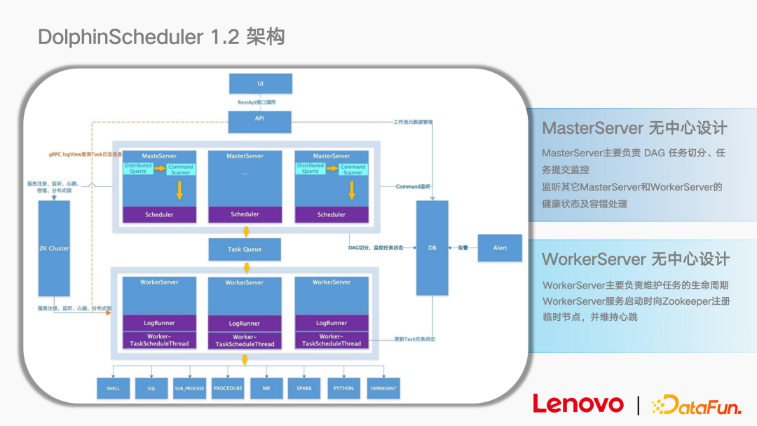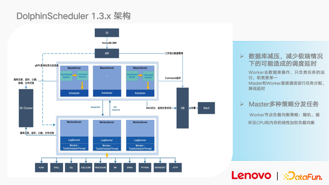 Apache DolphinScheduler 从一开始就采用了无中心化的设计,这样可以保证调度集群性能的线性增长。1.2 架构是 Apache DolphinScheduler 最初的架构,其中有两个重要的组件,即 MasterServer 和 WorkerServer。MasterServer 负责 DAG 任务的切分,将切分后的 DAG 任务生成工作流实例进行解析并提交。1.2 架构通过 zk 队列存储任务,Master 把任务存储到 zk 队列上,然后 Worker 再从 zk 队列去取,这种方式消耗比较大,同时,Worker 与 DB 产生交互后会更改 Task 任务的状态。因此,1.3 的架构对这两点进行了改进。(2)DolphinScheduler 1.3.x 架构
