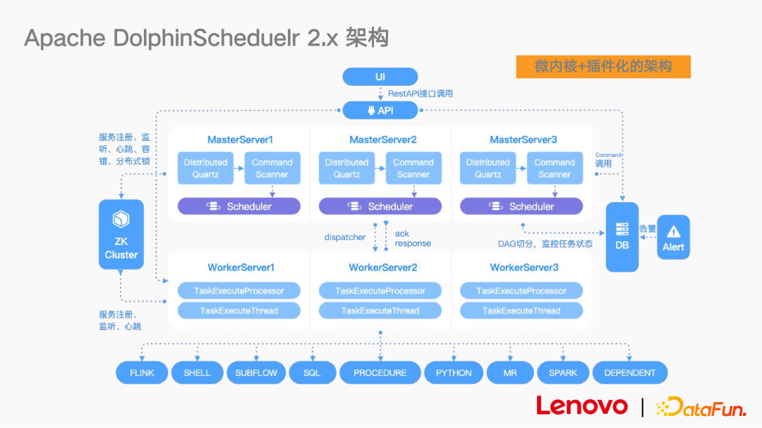 1.3.x 架构主要是对以上所说的两点问题进行了改善。首先是在 Master 与 Worker 之间引入了 Netty 通信,去除 zk 队列,大大减少了 Worker 获取任务运行的延迟。其次是在 Master 与 Worker 之间进行多种任务分发策略,Worker 只负责执行任务,职责变得更单一。Worker 把任务所执行的结果汇报给 Master,由 Master 统一对状态进行管理。(3)ApacheDolphinScheduler 2.x 架构