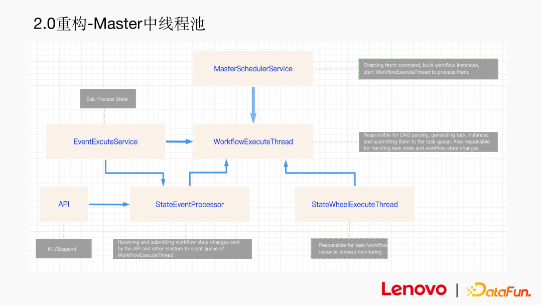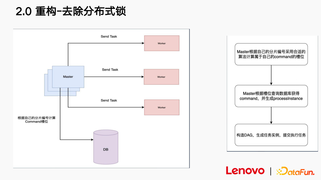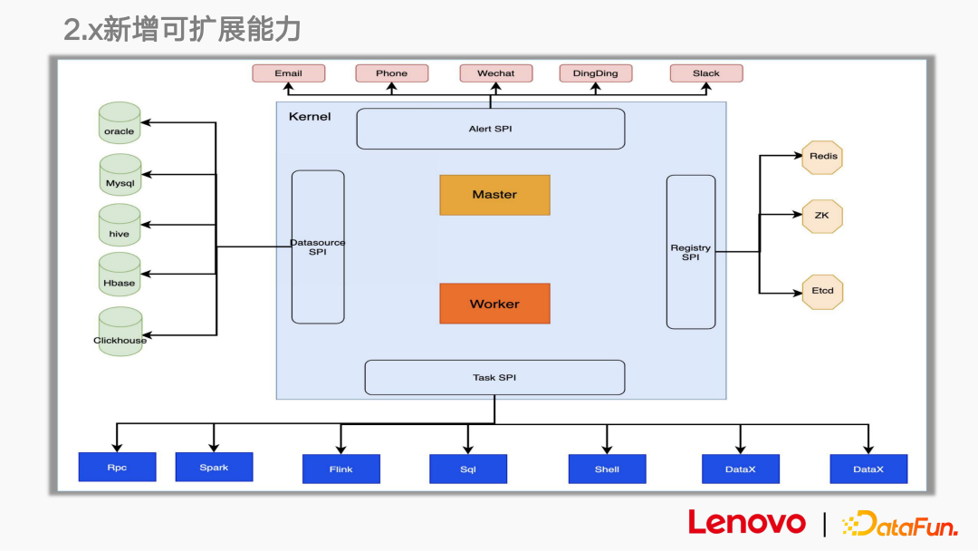 2.x 新增的可扩展能力主要是基于 SPI 插件化的设计。它不仅对任务进行了插件化,也对告警插件进行了 SPI 设计,包括注册中心和数据源,后期还会对资源的中心进行插件化的设计。采用 SPI 可以使代码变得更加的简洁,可增加调度系统的可扩展的能力,也便于二次任务的改造与开发,在多个的任务插件里面,各个任务插件的 pom 依赖互不影响。2.0 重构大大提升了 2.0 的并发能力。虽然在 1.x 架构里面是多个 Master 同时运行,但与 DB 进行交互的时候,会从数据库里取得 command,但需要采用分布式锁。2.0 去除了这个分布式锁,当 Master 动态上下线的时候,会根据自己的分片编号计算属于自己的槽位,然后根据槽位查询数据库取到属于自己的 command。在 1.x 的版本里面,线程池的使用数量相对较多一点,在 2.0 重构主要是对 Master 中线程池进行了一些优化,引入了事件驱动的机制:第一,MasterSchedulerService 线程去掉了分布式锁,从 DB 中取到 command 生成工作流实例进行拆分、提交任务。第二,在 WorkflowExecuteThread 线程里会维护一个事件的队列,然后去不断地处理变化,当有 Worker 发来的任务状态变化或 Master 发来流程实例状态的变化,WorkflowExecuteThread 线程就会进行相应处理。当 API 的界面上触发了如 KILL 或暂停操作这样的事件,会通过事件的机制,由 Master 统一去进行处理。