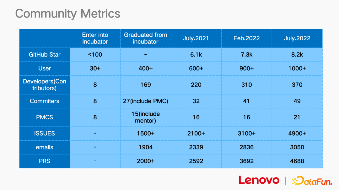 如图是 DolphinScheduler 的社区发展指标。可以看到 DolphinScheduler 从进入孵化器,到从孵化器毕业,再到现在,社区发展的各项指标都是呈指数级的增长,是一个具备很强生命力的 Community。其中,社区的用户数、开发者的数量、贡献者的数量,以及 Committer PMC 都有几何倍的增长,并且还在持续不断地上升。这些都说明了 DolphinScheduler 是一个健康的可持续发展的社区。基于以上原因,最终联想选择了 Apache