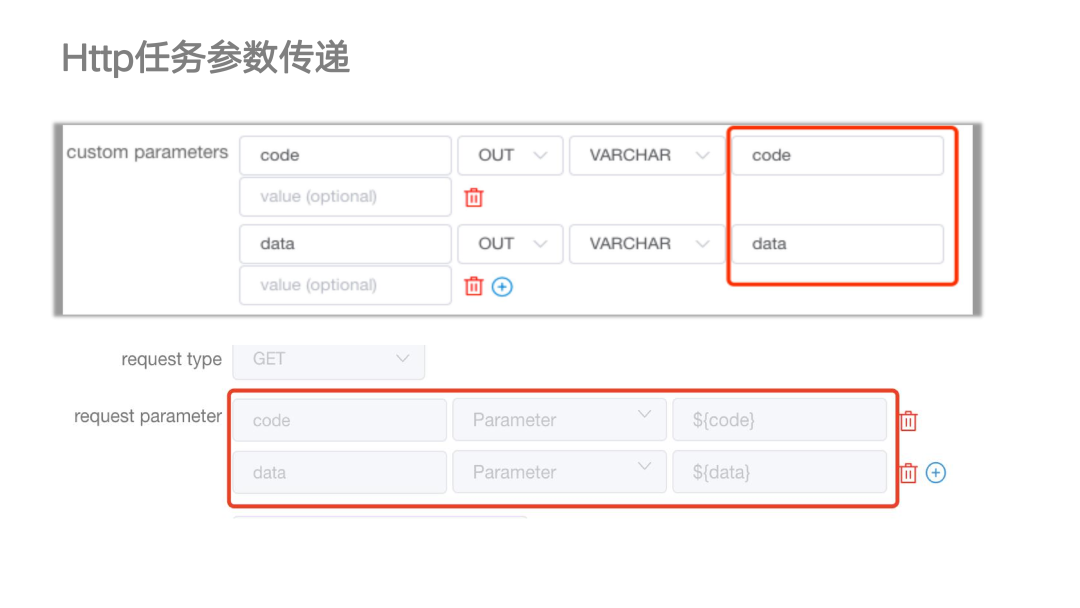 在一些非大数据的场景里面更多是 HTTP 任务,并且任务的请求参数之间存在依赖的关系,所以就提出了 HTTP 参数传递的功能。当时在社区 2.x 的版本里面只有 SQL 任务和 Shell 任务是支持参数传递,而 HTTP 任务不支持。因此,对调度进行了一些改造,在 HTTP 的任务节点里面的自定义的参数增加了 OUT 参数,也就是使任务的执行结果可以作为变量输出,并增加字段的解析。这样,就可以在 API 接口返回的结果取某个字段定义为输出变量,下一个 HTTP 任务就可以把其作为请求参数使用。