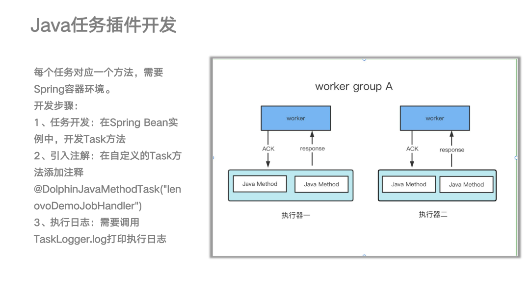 第二个改造是 Java 任务插件的开发。在之前的一些业务部门有一些 XXL-Job 的任务,需要对这些任务进行迁移。这些作业主要是通过 Spring Bean 里面的方法实现定时。对于 DolphinScheduler 而言,如果进行改造需要增加执行器的概念,由执行器和 Worker 进行通信,增加执行器与 Worker 之间的任务状态的汇报,最后再由 Worker 把最终的状态汇报给 Master。这个实现的原理是通过提供 SDK 开发执行器,提供一个注解给业务人员添加到自己编写的调度任务里,当程序启动的时候会扫描注解下面所有的方法,并在运行过程中将所执行的状态汇报给 Worker,由 Worker 汇报给 Master 进行统一管理。因此需要去抽象出一些必要的任务参数,并将其作为 Java 任务插件,从而实现在 DAG 上支持 Java 任务。